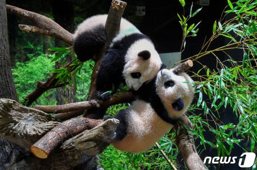 일본 도쿄 우에노 동물원에서 2021년 6월 태어난 쌍둥이 판다 레이레이와 샤오샤오가 나무에 매달려 있다. 2022.01.12/ ⓒ 로이터=뉴스1 ⓒ News1 권진영 기자 |