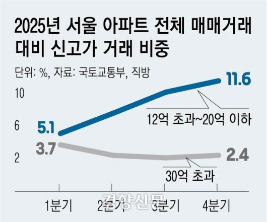 지난해 서울 아파트 신고가 거래는 하반기로 갈수록 30억원 초과 초고가 주택보다 9억~20억원대 아파트에서 더 많이 나타난 것으로 분석됐다.