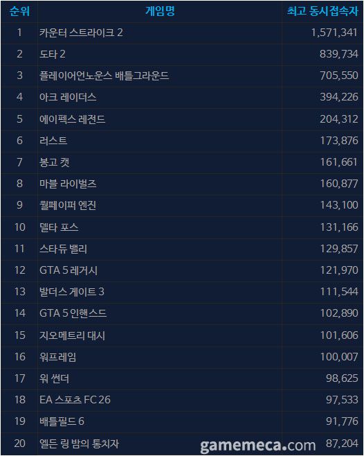 일 최고 동시접속자 TOP 20에서는 지오메트리 대시가 10만 1,606명으로 15위를 차지했다. 최근 계속된 상승세를 타며 18일에는 10만 6,251명의 최고 기록을 달성했는데, 업데이트와 같은 이슈가 없음에도 유저 수가 증가하고 있는 점이 눈에 띈다. EA 스포츠 FC 26은 9만 7,533명으로 순위권에 들었는데 올해의 팀 발표가 판매 순위에 이어 동시접속자 수에도 긍정적인 영향을 준 것으로 보인다.