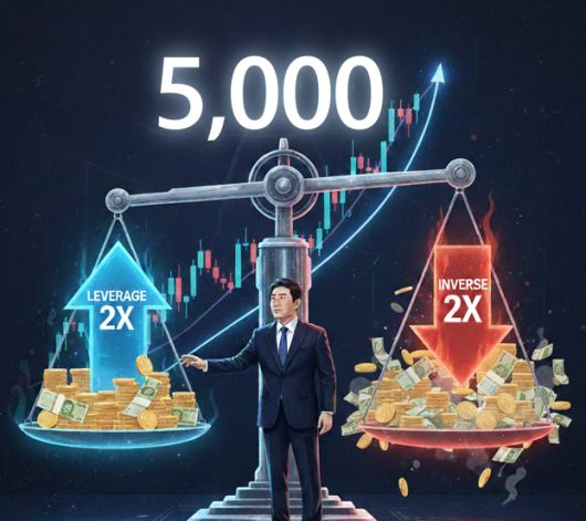 코스피 지수가 연일 사상 최고치를 갈아치우며 꿈의 지수 '5000'을 앞둔 가운데 국내 투자자들의 위험한 '방향성 베팅'도 극에 달하고 있다. 추가 상승에 대한 기대심리와 고점 이후 숨고르기가 있을 것이란 심리가 상존하는 국면이다. 수익률을 두 배로 추종하는 고배율 상장지수펀드(ETF)로의 자금 쏠림도 심화되는 추세다.