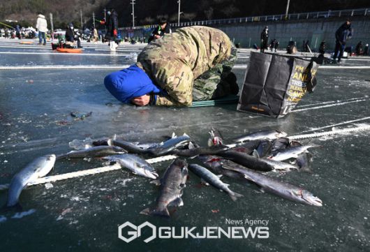 (화천=국제뉴스) 최옥현 기자 = 19일 화천산천어축제장을 찾은 관광객들이 얼음낚시를 즐기고 있다.