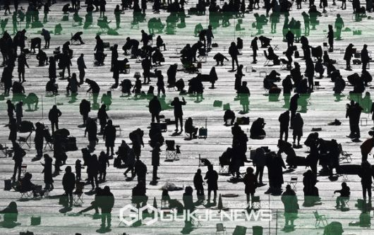 (화천=국제뉴스) 최옥현 기자 = 19일 화천산천어축제장을 찾은 관광객들이 얼음낚시를 즐기고 있다.