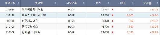 19일 코스피 상한가 종목. |