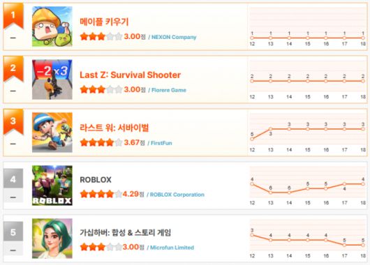 상위권에서는 종말 서바이벌 장르의 재정비가 눈에 띈다. ‘라스트Z: 서바이벌 슈터’는 지난주에 이어 2위를 유지하며 안정적인 흐름을 이어갔고, ‘라스트 워: 서바이벌’은 한 계단 더 올라 3위까지 치고 올라왔다. 메이플 키우기의 독주 체제를 가장 위협할 후보로 다시 한 번 존재감을 각인시키는 모양새다.