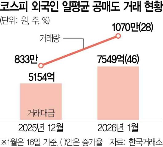 코스피가 ‘오천피’를 향해 속도를 내는 가운데 외국인의 공매도 거래가 빠르게 늘어난 것으로 나타났다. 지수는 주요국 가운데 가장 가파른 상승세를 이어가고 있지만 단기 과열에 대비한 헤지 수요 역시 동시에 확대되는 모습이다.