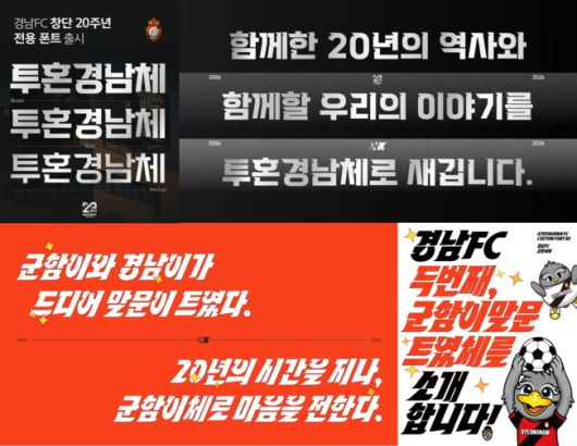 경남FC가 창단 20주년을 맞아 구단 정체성을 담아낸 전용서체 '투혼경남체' 3종(Black·Bold·Medium)과 마스코트 기반의 '군함이말문트였체' 1종을 공개했다. 총 4종으로 구성된 전용서체는 구단의 브랜드 일관성을 강화하고 팬과의 소통을 확대하기 위해 제작됐다.