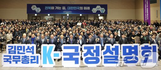 (전주=뉴스1) 전북사진기자단 = 김민석 국무총리와 김관영 전북특별자치도지사를 비롯한 참석자들이 19일 전북 전주시 전북대학교 JBNU컨벤션센터에서 열린 'K-국정설명회'에서 기념 촬영을 하고 있다. 2026.1.19/뉴스1Yks919@news1.krCopyright ⓒ 뉴스1. All rights reserved. 무단 전재 및 재배포, AI학습 이용 금지.
