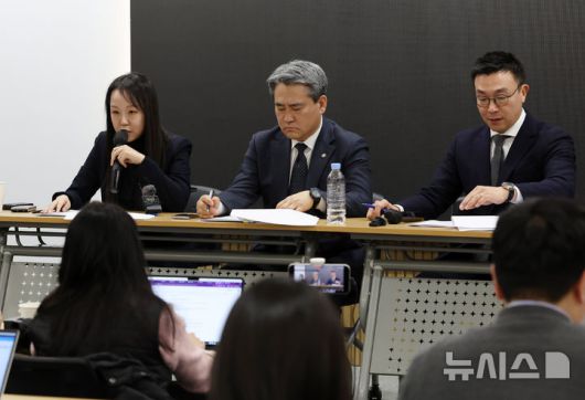 [서울=뉴시스] 이영환 기자 = 윤석열 전 대통령 변호인단 유정화(왼쪽부터), 송진호, 최지우 변호사가 19일 오후 서울 서초구 라이프비즈니스센터에서 2025고합1010 특수공무집행방해 등 판결 관련 기자회견을 하고 있다. 2026.01.19. 20hwan@newsis.com |