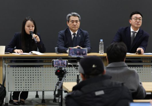윤석열 전 대통령 변호인단 유정화(왼쪽부터), 송진호, 최지우 변호사가 19일 오후 서울 서초구 라이프비즈니스센터에서 2025고합1010 특수공무집행방해 등 판결 관련 기자회견을 하고 있다. 뉴시스 |