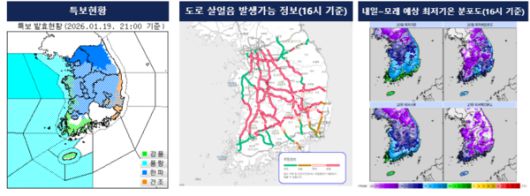 강추위가 이어지는 지역에서는 내린 눈이 얼어 도로 빙판과 살얼음이 나타날 우려가 많다. 보행·교통 안전에 각별한 주의가 요구된다. 각 고속도로 노선 도로 살얼음 정보(도로기상정보시스템) 확인이 필요하며, 기상청은 정보가 제공되지 않는 구간에서도 주의를 당부했다.