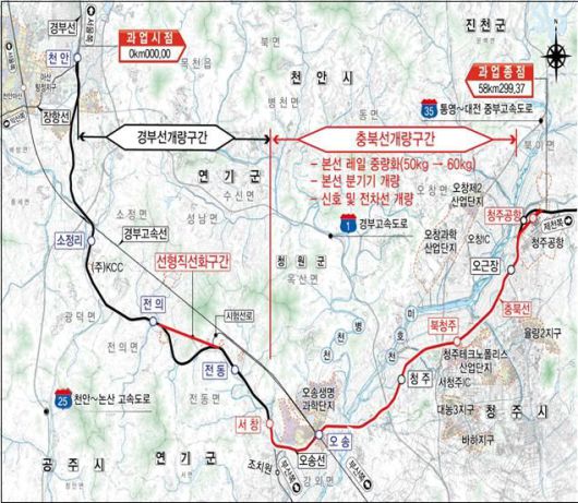 총사업비 5610억원을 들여 2030년까지 천안~서창~오송~북청주~청주공항 57㎞ 구간을 복선 전철화할 계획이다.