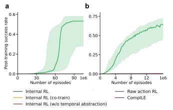 결과는 인상적이었다. GRPO나 CompILE 같은 기존 방법들이 100만 에피소드 안에서도 과제를 해결하지 못했지만, 내부 RL은 훨씬 적은 학습 횟수로도 높은 성공률을 기록했다.