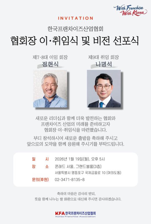 나명석 신임 협회장은 취임사에서 프랜차이즈 산업의 신뢰 회복과 재도약을 위한 4대 비전으로 상생·윤리경영 강화 공제사업 등 복지 강화 K-프랜차이즈 글로벌화 정책·언론 기능 강화를 제시했다.
