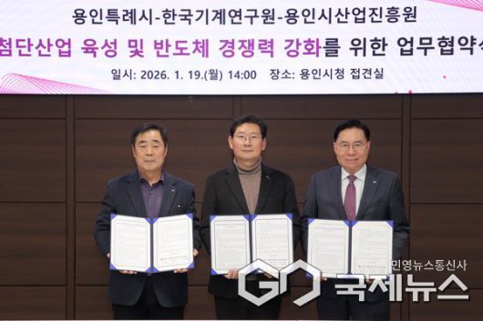 (용인=국제뉴스) 강정훈 기자 = 용인시(시장 이상일)는 19일 시청 접견실에서 한국기계연구원(KIMM), 용인시산업진흥원과 '첨단산업 육성 및 반도체 경쟁력 강화를 위한 업무협약'을 체결했다.