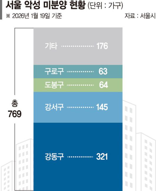 문제는 준공 후 미분양이 고착화될 조짐을 보이고 있다는 점이다. 서울의 경우 현재 강동구(악성 미분양 321가구), 강서구(145가구) 등 일부 지역에서 준공 후 미분양이 장기간 팔리지 않고 있다.