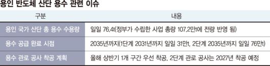 19일 업계에 따르면 용인 반도체 국가산업단지의 공업용수 사용량은 가동시점인 오는 2035년 기준 일일 약 76만4000t에 달할 것으로 추정된다. 해당 내용은 이미 정부가 수립한 '용인 반도체 클러스터 용수 공급 사업'에 전량 반영됐다. 단계별로 1단계인 2031년까지 일일 31만t, 2단계 2035년까지 76만t의 용수를 공급하겠다는 것이 골자다.