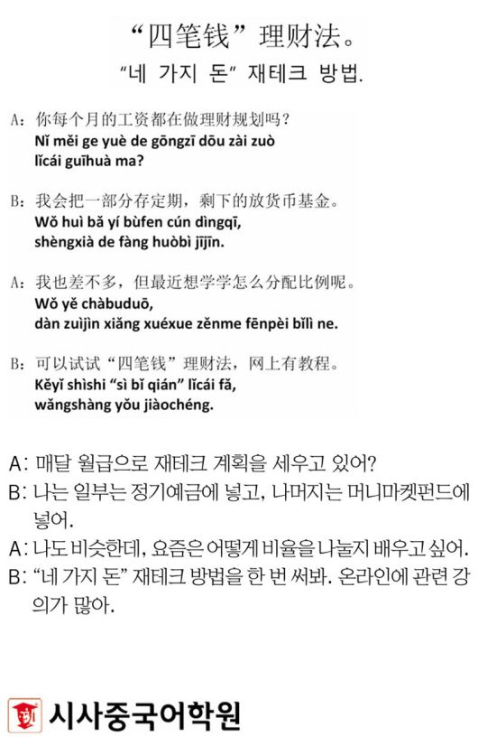 [시사중국어학원의 리얼 중국어 회화] “네 가지 돈” 재테크 방법.