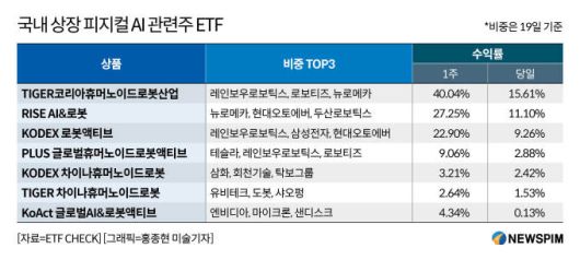 [서울=뉴스핌] 윤채영 기자 = ETF 트렌드가 '피지컬 AI(Physical AI)'로 빠르게 확산하고 있다. AI가 텍스트와 이미지 생성에 머물렀던 국면을 넘어, 현실 세계에서 스스로 판단하고 움직이는 로봇·자율주행·제조 자동화 영역으로 확장되면서 관련 ETF들이 국내 시장에서 수익률 상위권을 잇달아 차지하는 양상이다.