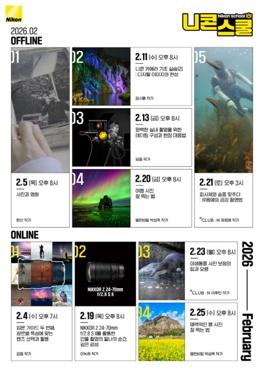 1일 니콘이미징코리아에 따르면 오프라인 강의는 2월 5일 영화 속에서 사진이 등장하는 주요 장면을 함께 감상하며 사진의 본질적인 의미를 탐구하는 '사진과 영화' 강의로 시작된다. 2월 11일에는 지난 1월 강의의 심화 과정인 '니콘 카메라 기초 실습(2): 디지털 이미지와 현상' 이 진행되며, 2월 13일에 진행되는 '완벽한 실내 촬영을 위한 테더링 구성과 현장 대응법' 강의를 통해서는 니콘의 PC용 소프트웨어인 'NX Tether'의 활용법과 실내 촬영 팁을 전수한다.