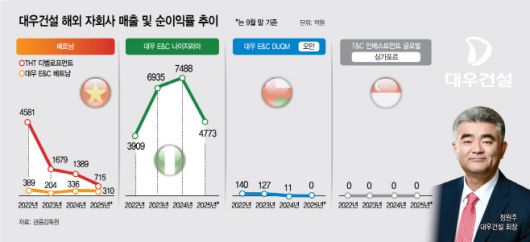 다만 해외 실적이 베트남·나이지리아에 집중돼 있다는 점은 숙제다. 실제 지난해 9월 말까지 오만, 싱가포르, 미국, 인도네시아, 인도 등 법인은 매출이 없다. 점진적으로 육성해 나갈 계획이지만, 이들 법인은 2024년에도 매출이 11억원에 불과(오만)했거나 아예 없다. 특히 오만에 위치한 대우 E&C DUQM의 매출은 140억원(2022년 말)에서 11억원(2024년 말)으로 줄어들었고, 지난해엔 9월말까지 매출이 없다.