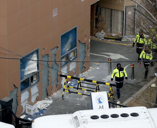 서울서부지법 난입 폭동이 발생한 지난해 1월19일 법원 외벽과 유리창이 깨져 있다. 문재원 기자 |