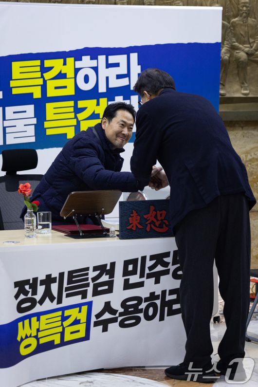 (서울=뉴스1) 유승관 기자 = 장동혁 국민의힘 대표가 19일 서울 여의도 국회 로텐더홀에 마련된 단식 농성장에서 박형준 부산시장을 접견하고 있다. 2026.1.19/뉴스1