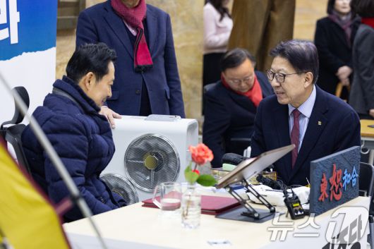 (서울=뉴스1) 유승관 기자 = 장동혁 국민의힘 대표가 19일 서울 여의도 국회 로텐더홀에 마련된 단식 농성장에서 박형준 부산시장을 접견하고 있다. 2026.1.19/뉴스1