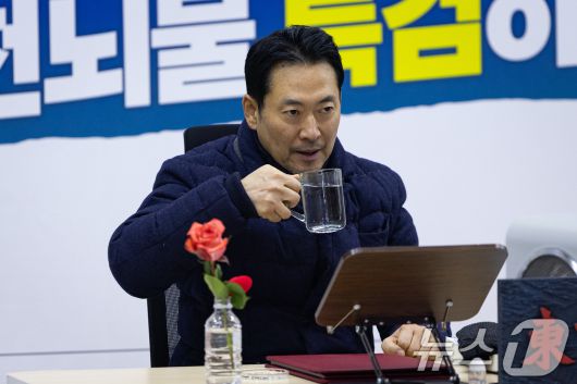 (서울=뉴스1) 유승관 기자 = 장동혁 국민의힘 대표가 19일 서울 여의도 국회 로텐더홀에 마련된 단식 농성장에서 물을 마시고 있다. 2026.1.19/뉴스1