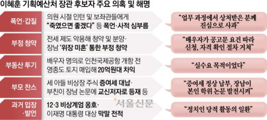 이 후보자는 지난달 28일 장관직 후보로 지명된 후부터 각종 의혹이 야권에서 제기되며 ‘1일 1의혹’이라는 오명을 썼다. 이 후보자가 반포 ‘래미안 원펜타스’ 아파트 청약에 당첨되는 과정에서 장남 ‘위장 미혼’ 논란이 불거지자 사퇴 요구가 거세게 일었다.