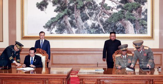 2018년 9월19일 평양 백화원 영빈관에서 문재인 당시 대통령과 김정은 북한 국무위원장이 송영무 국방부 장관과 노광철 인민무력상의 판문점선언 이행을 위한 군사분야 합의문(9·19 남북군사합의) 서명을 지켜보고 있다. 평양/사진공동취재단 |