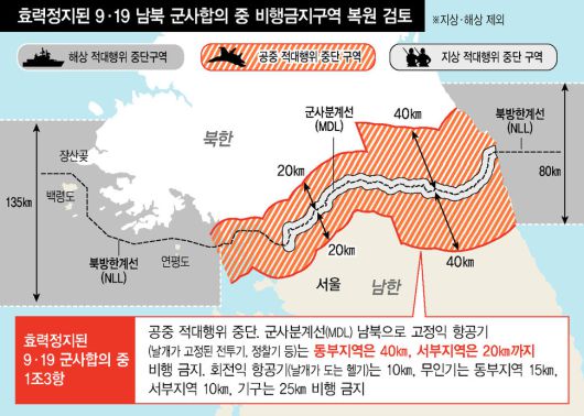 정부가 9·19 남북군사합의 가운데 ‘공중완충구역’(비행금지구역)을 먼저 복원하기로 한 이유로는 한국이 북한보다 공군력과 정찰 능력이 월등히 앞서 있어, 공중·해상완충구역 복원보다 상대적으로 군사적 부담이 덜하다는 게 우선 꼽힌다. 정부는 군사정찰위성, 중고도·고고도의 유·무인 정찰기 등을 통합 운영 중인 우리 군으로선 비행금지구역을 복원해도 감시·정찰 시스템에는 별다른 공백이 발생하지 않는다는 것이다.