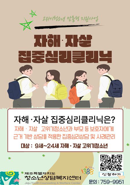 제주도청소년상담복지센터가 자해·자살 문제 등에 노출된 고위기청소년을 조기에 발견하고 심리적 안정을 지원하기 위해 ‘2026년 고위기청소년 집중심리클리닉’을 운영한다 |