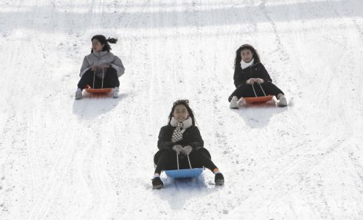 눈이 내리고 '1년 중 가장 춥다'는 절기상 대한(大寒)을 하루 앞둔 19일 충북 청주시 상당구 낭추골현장체험학습원에서 어린이들이 눈썰매를 타고 있다. |