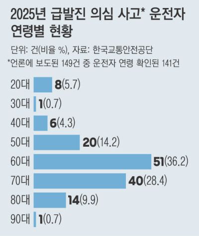 특히 급발진 의심사고의 운전자 4명 중 3명 이상이 60대 이상이었다. 운전자 연령이 확인된 사고 141건 가운데 60대가 운전한 경우가 51건(36.2%)으로 가장 많았고, 다음은 70대(40건·28.4%), 50대(20건·14.2%) 순이었다.
