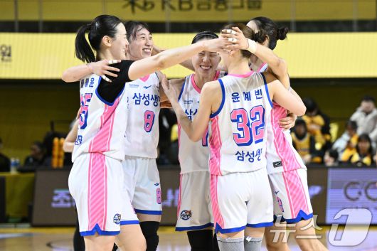 (청주=뉴스1) = 삼성생명 배혜윤, 이주연, 강유림, 윤예빈, 이해란이 19일 충북 청주체육관에서 열린 BNK 금융 2025-2026 여자프로농구 KB스타즈와의 경기에서 승리를 확정지은 뒤 기뻐하고 있다. (WKBL 제공. 재판매 및 DB 금지) 2026.1.19/뉴스1