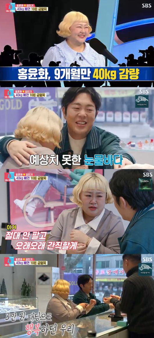 앞서 남편 김민기는 홍윤화가 체중 40kg을 감량하면 10돈 금팔찌를 선물하기로 약속했다.