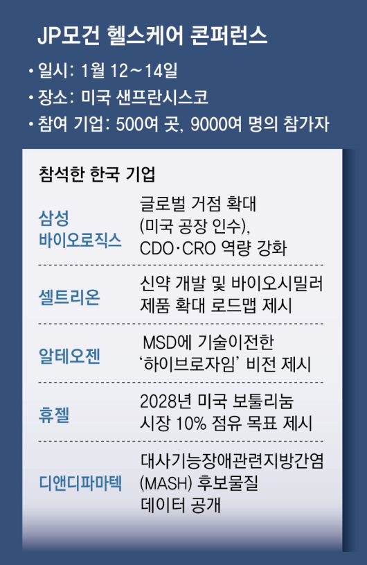 전 세계 제약바이오 기업 500여 곳이 참여한 세계 최대 제약바이오 투자 콘퍼런스인 ‘JP모건 헬스케어 콘퍼런스(JPMHC)’가 미국 샌프란시스코에서 15일(현지 시간) 막을 내렸다. 행사에 참여한 기업들의 시가총액만 약 10조 달러(약 1경4700억 원)에 달하는 이번 행사에서 한국 기업들은 다양한 분야에서 존재감을 드러냈다.