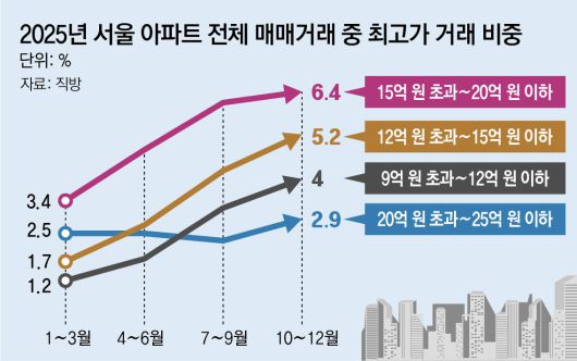 19일 부동산 플랫폼 직방에 따르면 지난해 4분기(10∼12월) 12억 원 초과∼15억 원 이하 아파트의 최고가 거래 비중은 5.2%였다. 1분기(1∼3월)의 1.7%에 비해 3배 수준으로 늘어났다. 9억 원 초과∼12억 원 이하 아파트의 최고가 거래 비중도 1분기(1.2%)에 비해 4분기(4%)에 크게 늘어났다. 반면 1분기 3.7%였던 30억 원 초과 아파트의 최고가 거래 비중은 4분기에는 2.4%로 오히려 줄어들었다.