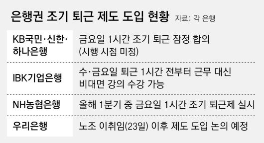 NH농협은행은 지난해 말 노사 협의에 따라 올 1분기(1∼3월) 중 조기 퇴근을 실시한다. IBK기업은행은 이미 이달 7일부터 매주 수·금요일 퇴근 시간보다 1시간 일찍 회사를 나와 금융연수원 비대면 강의를 들을 수 있는 연수 프로그램을 운영 중이다. 이는 1시간 조기 퇴근제의 준비 단계로 평가받고 있다.