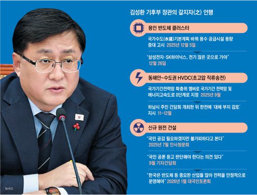 국가 에너지·환경 인프라의 열쇠를 쥔 김성환 기후에너지환경부 장관의 ‘갈지자(之) 행보’가 산업 경쟁력의 발목을 잡고 있다는 지적이 나온다. 자신의 명의로 확정 고시한 반도체 산업단지 지원 계획을 뒤집는 발언을 하거나, 지역 민원을 이유로 국책 전력망 사업을 지연시키는 등 정책 혼선을 자초하고 있다는 것이다.