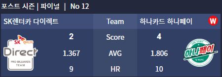 앞서 열린 1차전 승리에 이어 2차전까지 쓸어 담은 하나카드는 시리즈 전적 2승 0패를 기록했다. 역대 PBA 팀리그 파이널에서 1, 2차전을 모두 승리한 팀이 우승하지 못한 적은 없다. 하나카드는 '우승 확률 100%'라는 강력한 데이터를 손에 쥐었다.