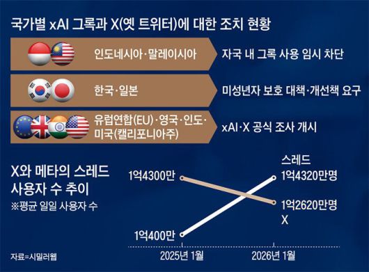그록은 이전에도 수차례 흑인 비하와 유대인 조롱 등 논란에 휩싸인 적이 있지만, 이번처럼 세계 각국이 잇따라 강력한 조치에 나선 건 처음이다. 미성년자 나체 이미지 생성 논란 이후 말레이시아·인도네시아 등 무슬림 국가는 그록 사용을 일시 중단시켰다. 영국·인도·브라질 등은 그록 운영사인 xAI와, 그록을 탑재한 머스크 소유의 X에 대한 조사를 시작했다. 한국 정부도 X에 미성년자 보호 대책을 요구했다.