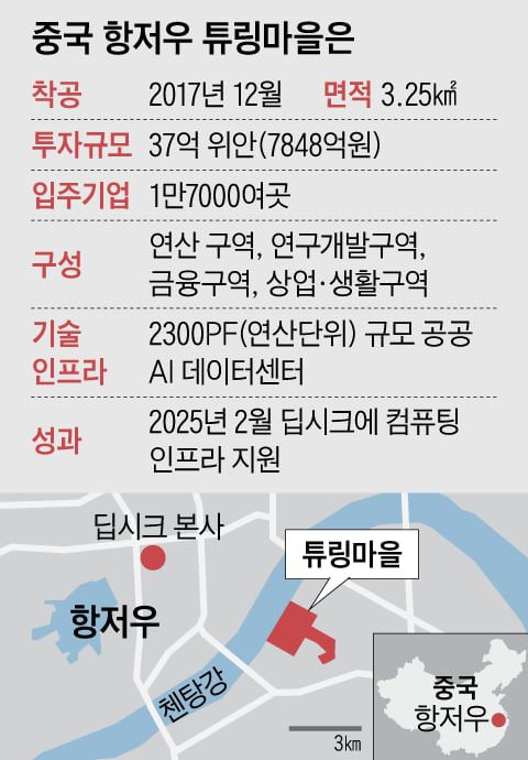 공사가 한창인 항저우 튜링 마을은 딥시크 AI 모델 확산의 일등 공신(功臣)이다. 지난해 2월 이곳에 들어선 공공 AI 데이터센터는 딥시크 ‘R1 만혈판(무삭제 버전)’에 컴퓨팅 파워를 제공했다. 미국 빅테크만큼 강력한 성능은 아니지만 미국 반도체 규제로 최신 칩을 구하지 못한 중국 AI 기업에는 ‘생존 키트’였다. 덕분에 현지 AI 기업들은 곧장 딥시크 AI 모델을 테스트하고 활용해 서비스 개발에 나설 수 있었다.