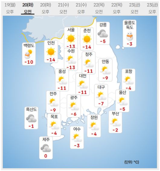 20일 아침최저기온은 -13~-10℃, 낮최고기온은 -2~0℃가 되겠다.