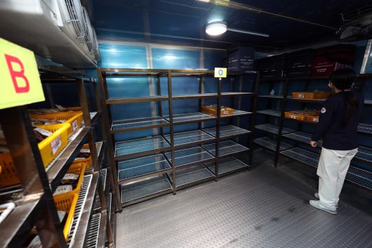 19일 부산 부산진구 대한적십자사 부산혈액원 혈액저장고에서 한 직원이 비어 있는 선반 사이로 남은 혈액을 확인하고 있다. 이날 0시 기준 부산의 혈액 보유량은 3.2일분으로 적정 보유량인 5일분에 크게 못 미쳤다. 부산=뉴시스 Copyright Ⓒ 동아일보. All rights reserved. 무단 전재, 재배포 및 AI학습 이용 금지