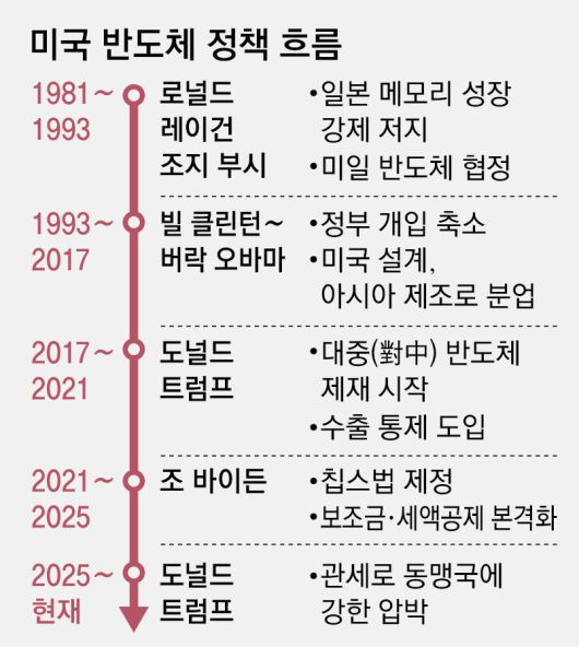미국은 반도체를 국가 전략 산업으로 보고 1980년대부터 자국 산업 보호를 위해 강온 정책을 펼쳐왔다. 1980년대 로널드 레이건 행정부 당시 일본 메모리 기업들을 쑥대밭으로 만든 ‘미일 반도체 협정’이 대표적이다.