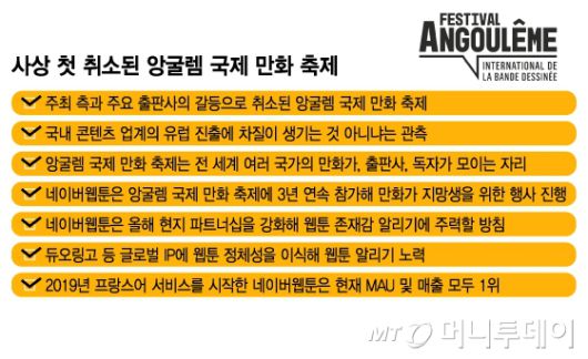 '만화계의 칸 영화제'로 불리는 프랑스 앙굴렘 국제 만화 축제가 주최 측과 주요 출판사 간 갈등으로 전격 취소됐다. 해외판 '기안84(스타 웹툰 작가)'를 찾으려 공들여온 네이버웹툰이 유럽 창작자 발굴 전략에 차질이 생길 수 있다는 우려가 나온다. 네이버웹툰은 현지 파트너십 확대와 자체 창작자 육성 프로그램을 통해 공백을 메우겠다는 입장이다.