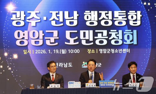김영록 전남도지사가 전남 영암군 청소년센터에서 열린 '광주전남 행정통합 도민공청회'에서 우승희 영암군수, 김대중 전남교육감 등과 함께 주민과 질의 응답을 하고 있다. (자료사진) /뉴스1 ⓒ News1 김태성 기자 |