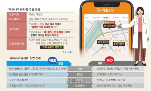 반대 측은 과잉 규제라고 맞선다. 법안이 통과되면 닥터나우는 플랫폼 사업과 도매업 중 하나를 포기해야 한다. 의료기관이나 약사처럼 처방·조제를 하지 않는데 동일선상에서 규제하는 것은 무리라는 주장이다.
