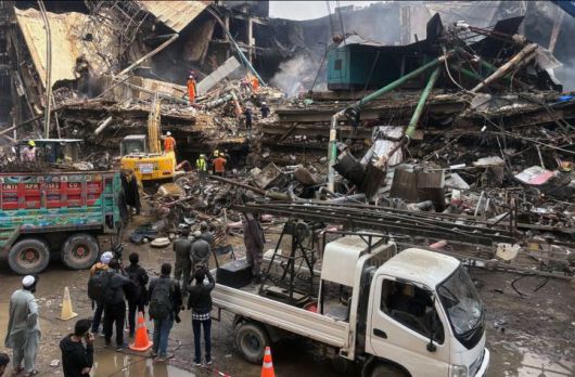 [카라치=AP/뉴시스] 19일 파키스탄 카라치의 쇼핑몰 화재 현장에서 구조대원과 소방관들이 중장비를 이용해 불에 탄 건물의 잔해를 수색하고 있다. 2026.01.20. *재판매 및 DB 금지 |